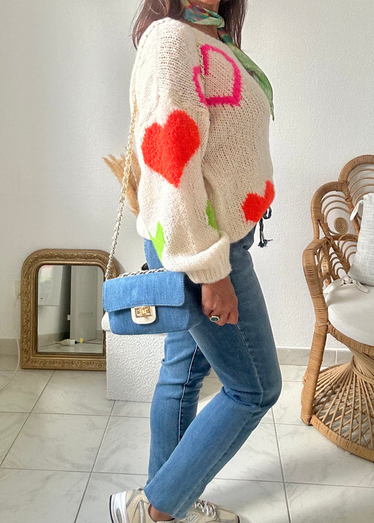 Pull maille écru coeurs multicolores TU